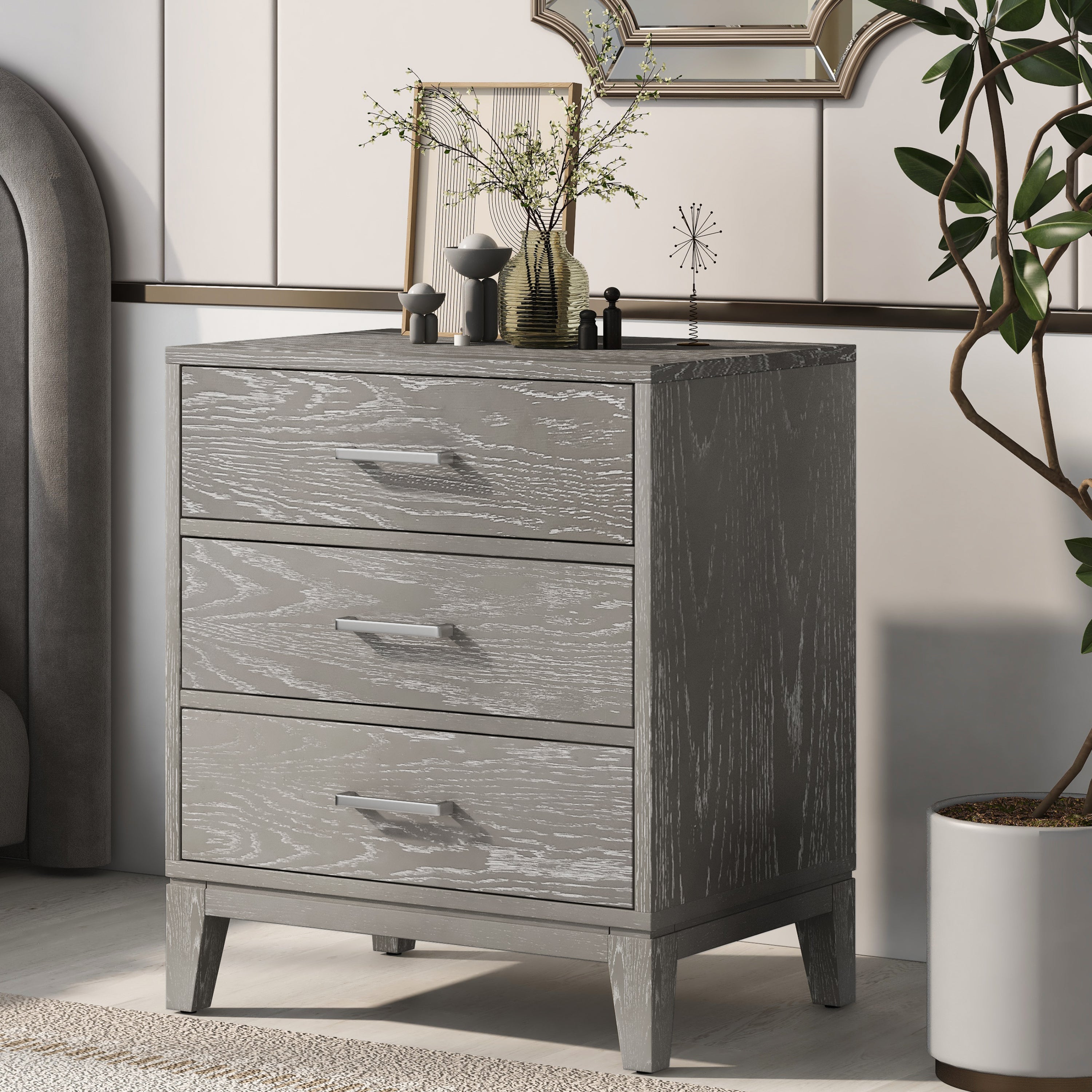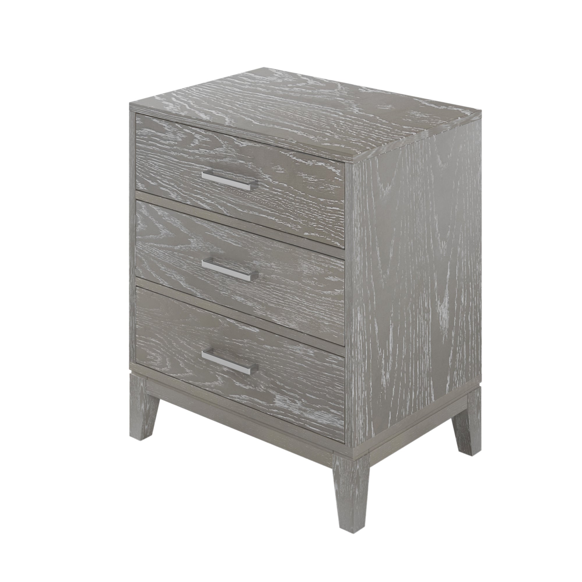 Simple and suitable for a variety of environments, this Gray wood grain nightstand features clear lines and huge storage space to keep your items and more.
