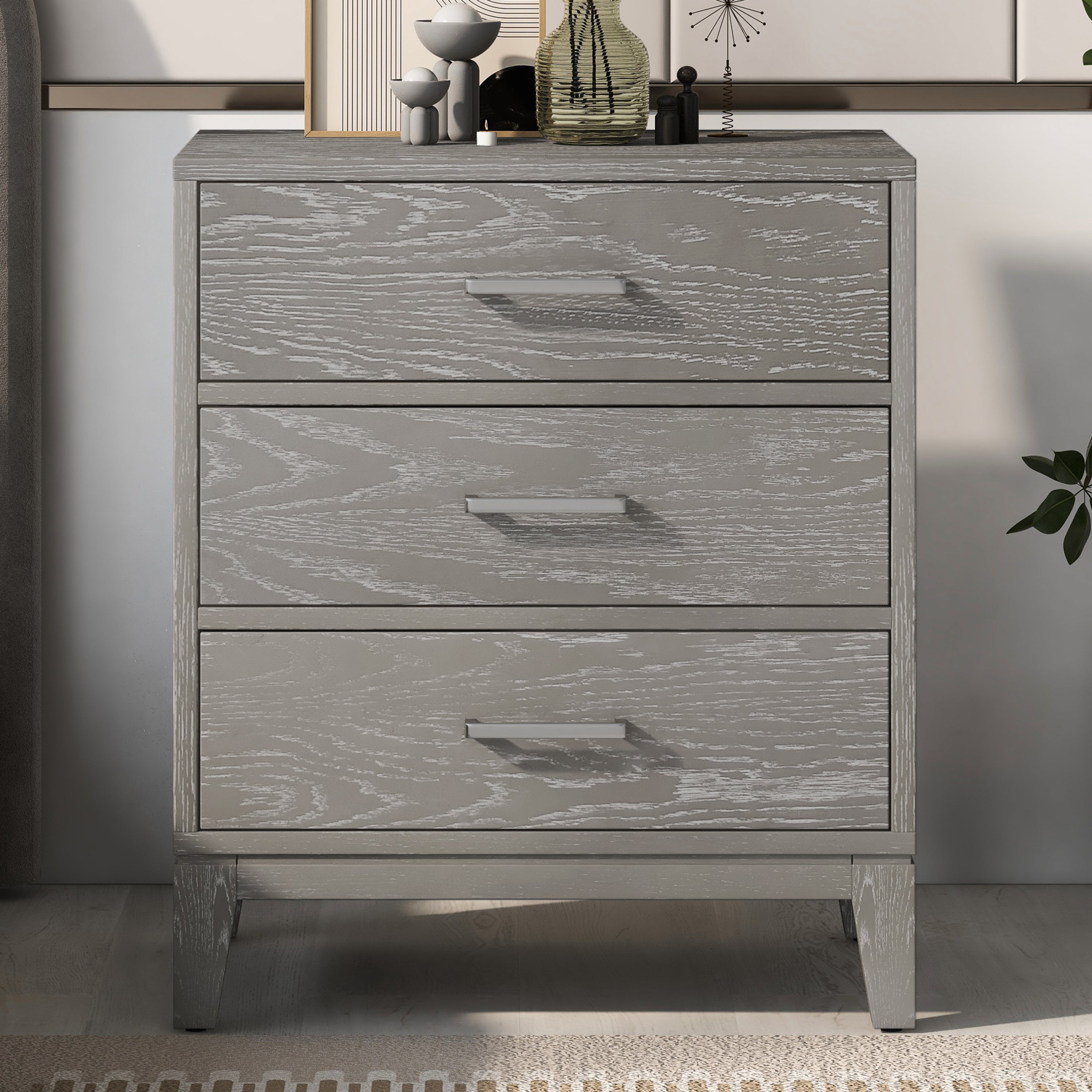 Versatile Design: Add modern sophistication to your decor with the weathered gray finish and stainless-steel metal handles of this versatile dresser.