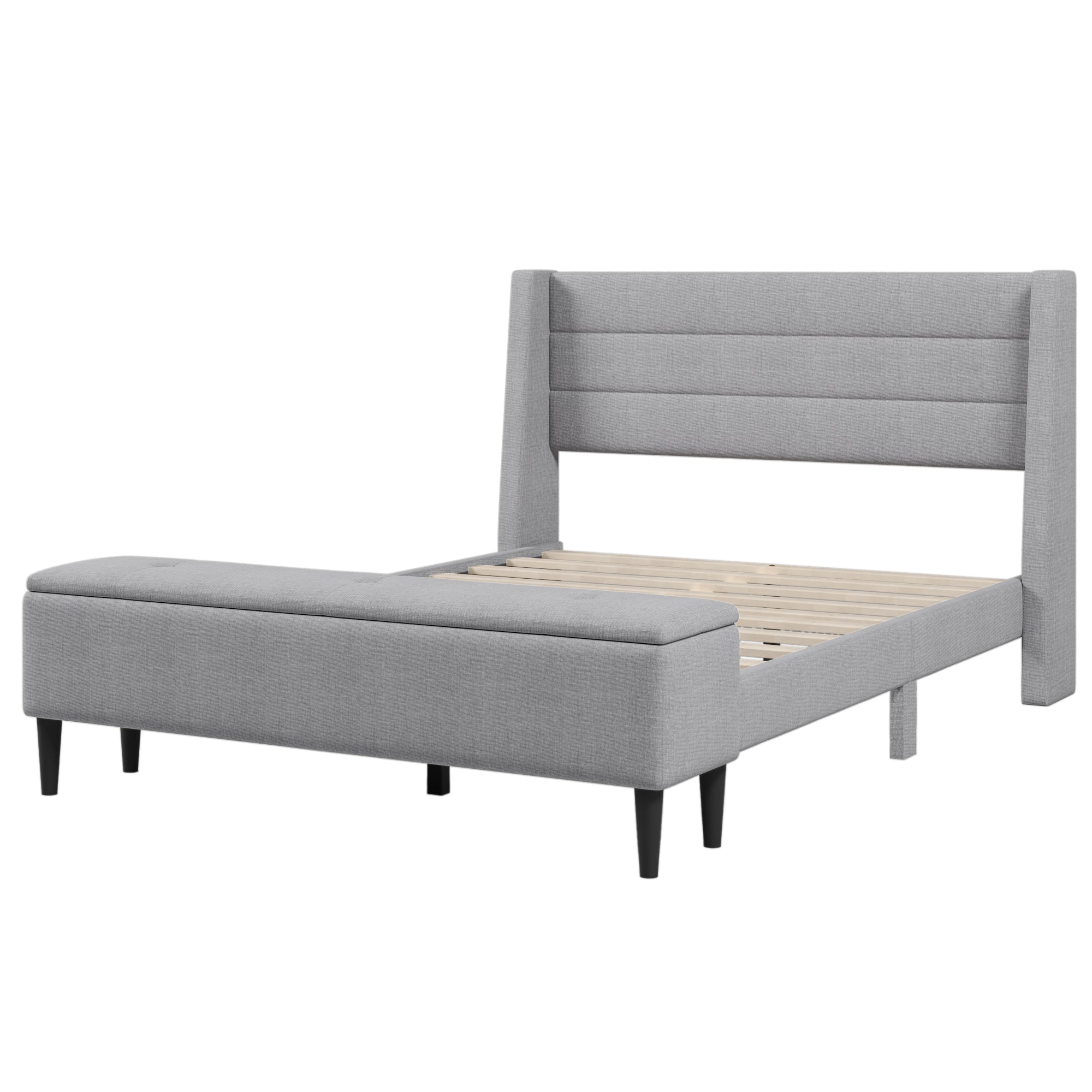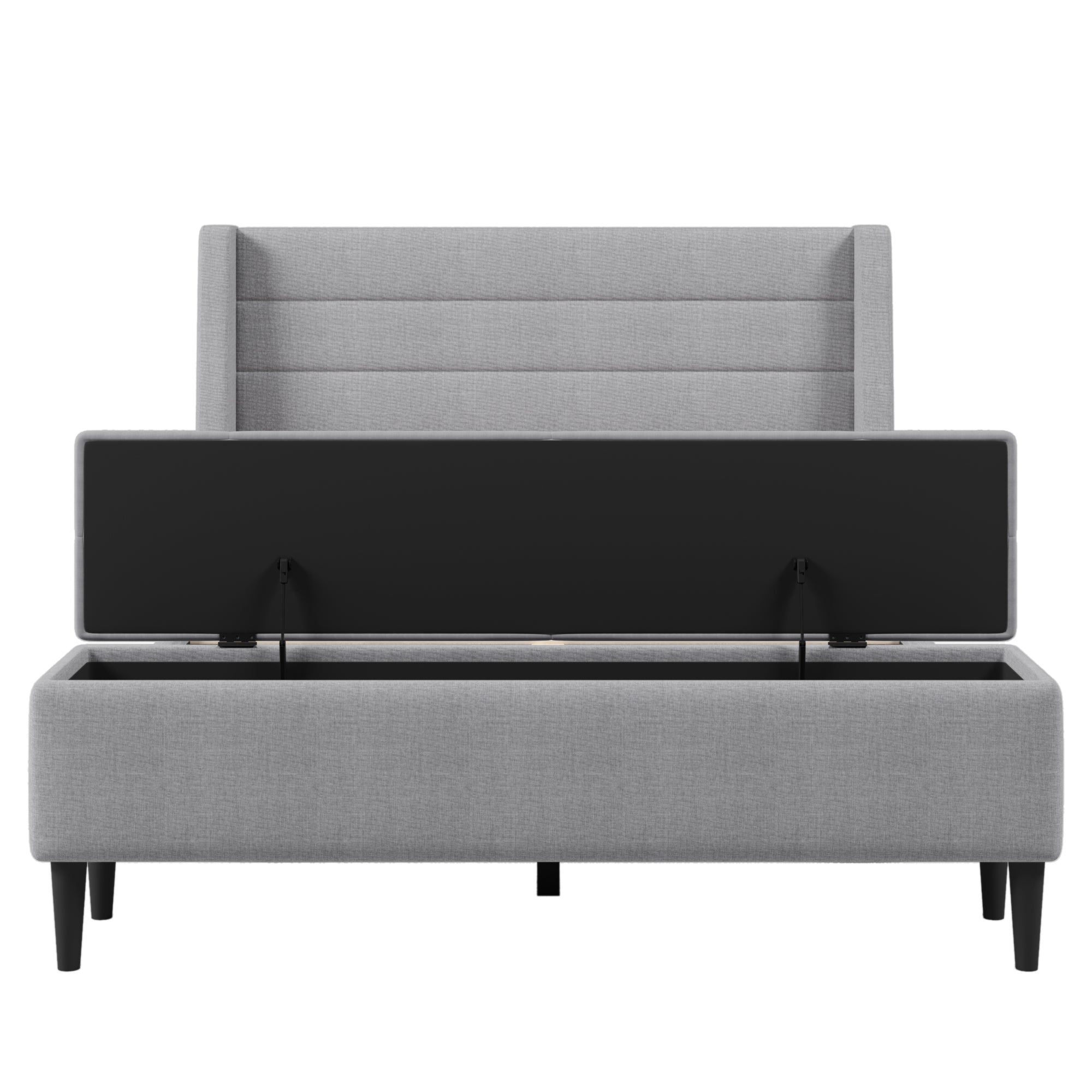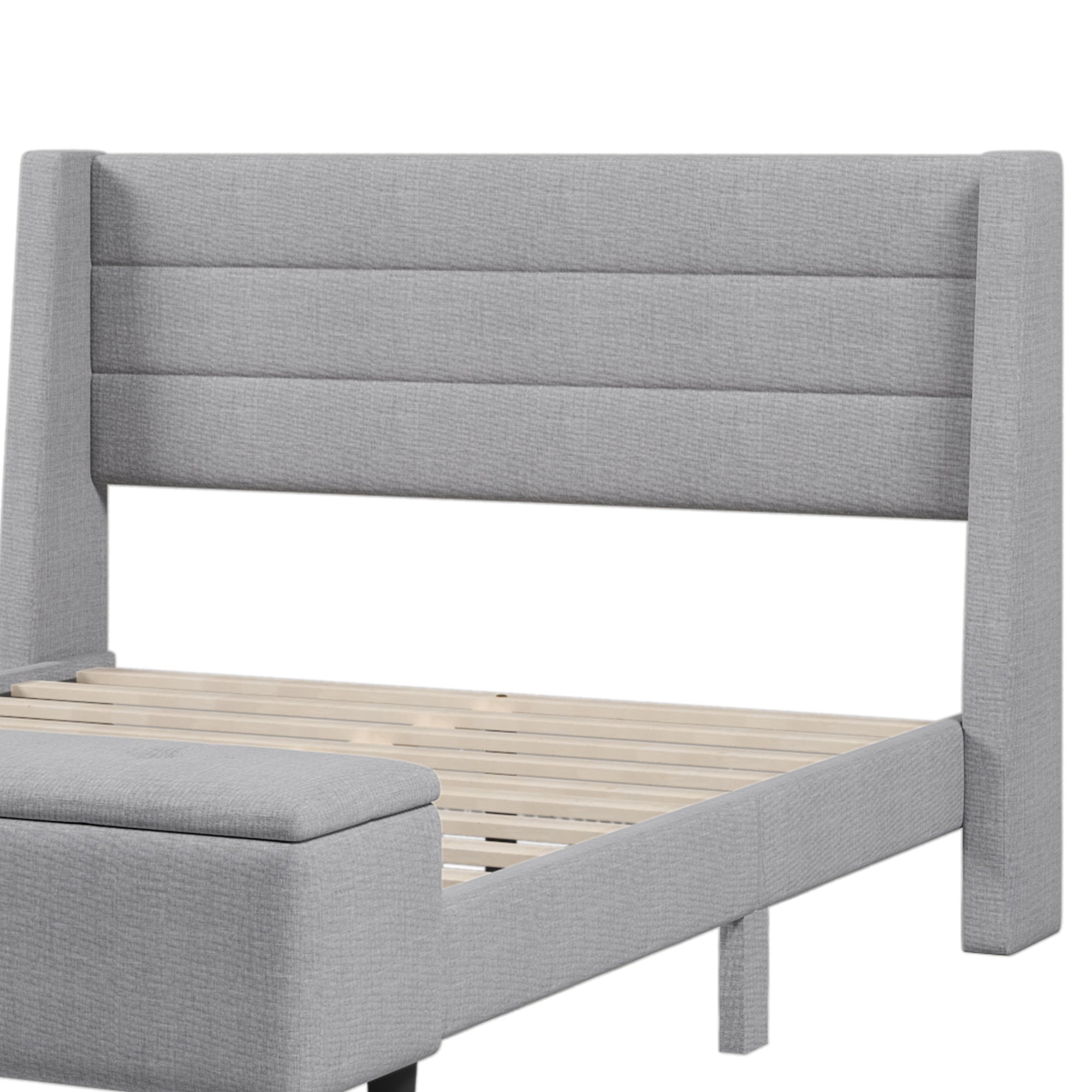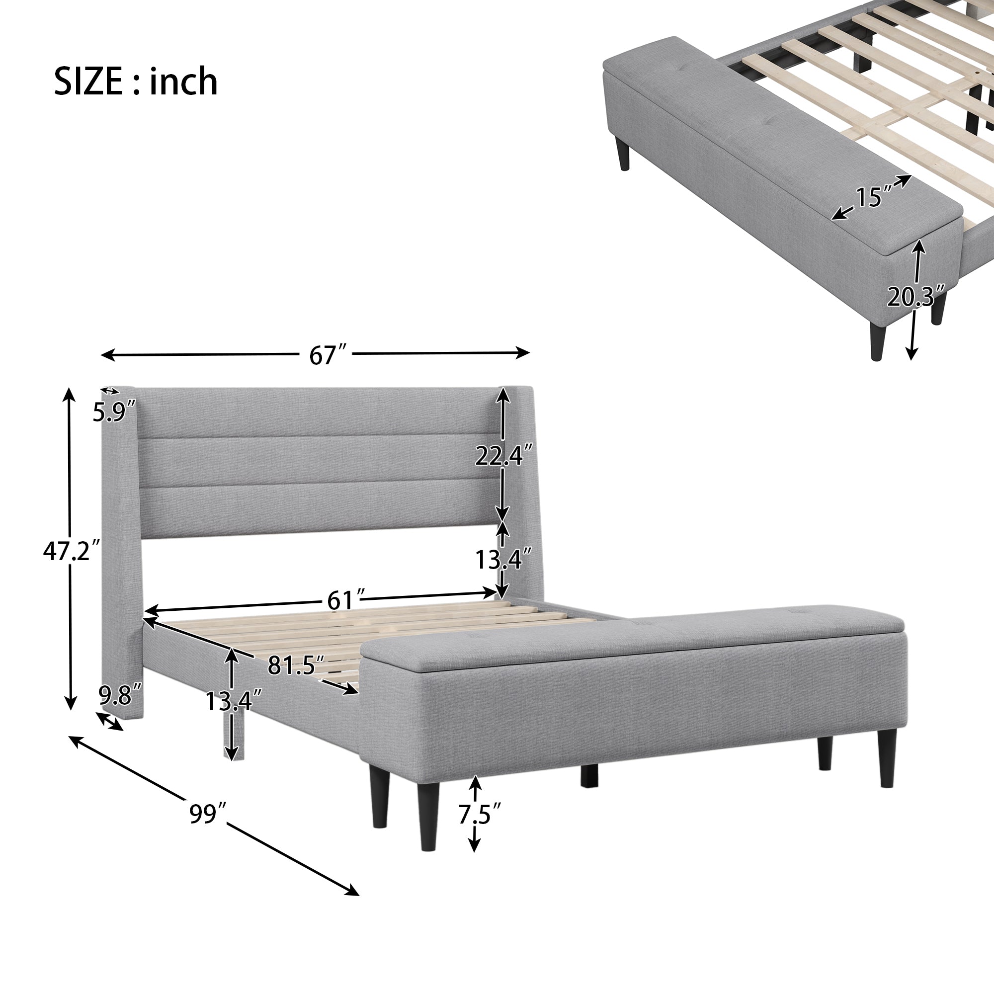 If you're lacking space to tuck away your cherished belongings, if your closets are bursting at the seams, you should really consider buying this bed. Transform your bedroom with this bed with cushioned headboard and storage ottoman. The wingback bed is upholstered with beige fabric and detailed with linear tufting for texture. A matching storage ottoman is included to easily organize extra bedding.