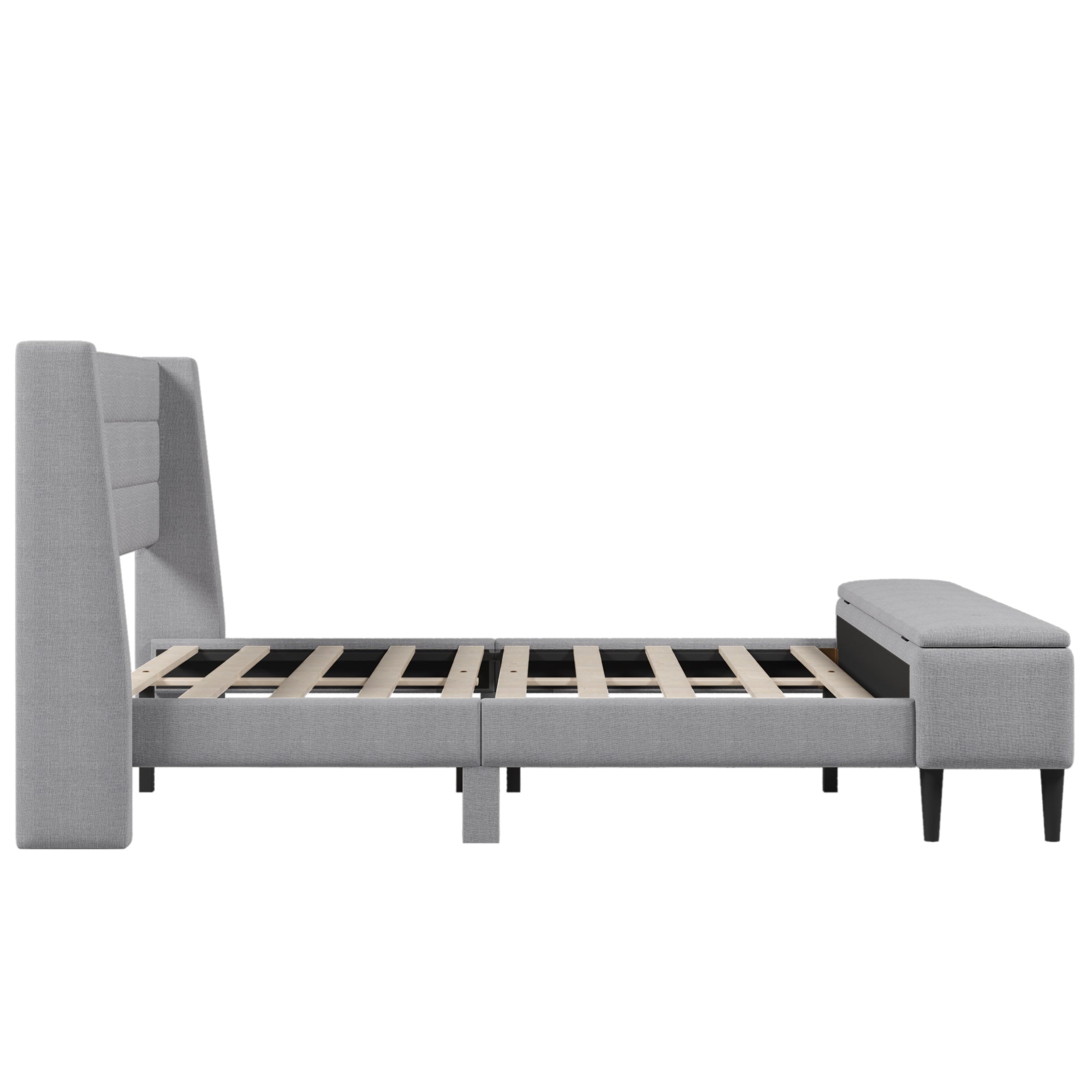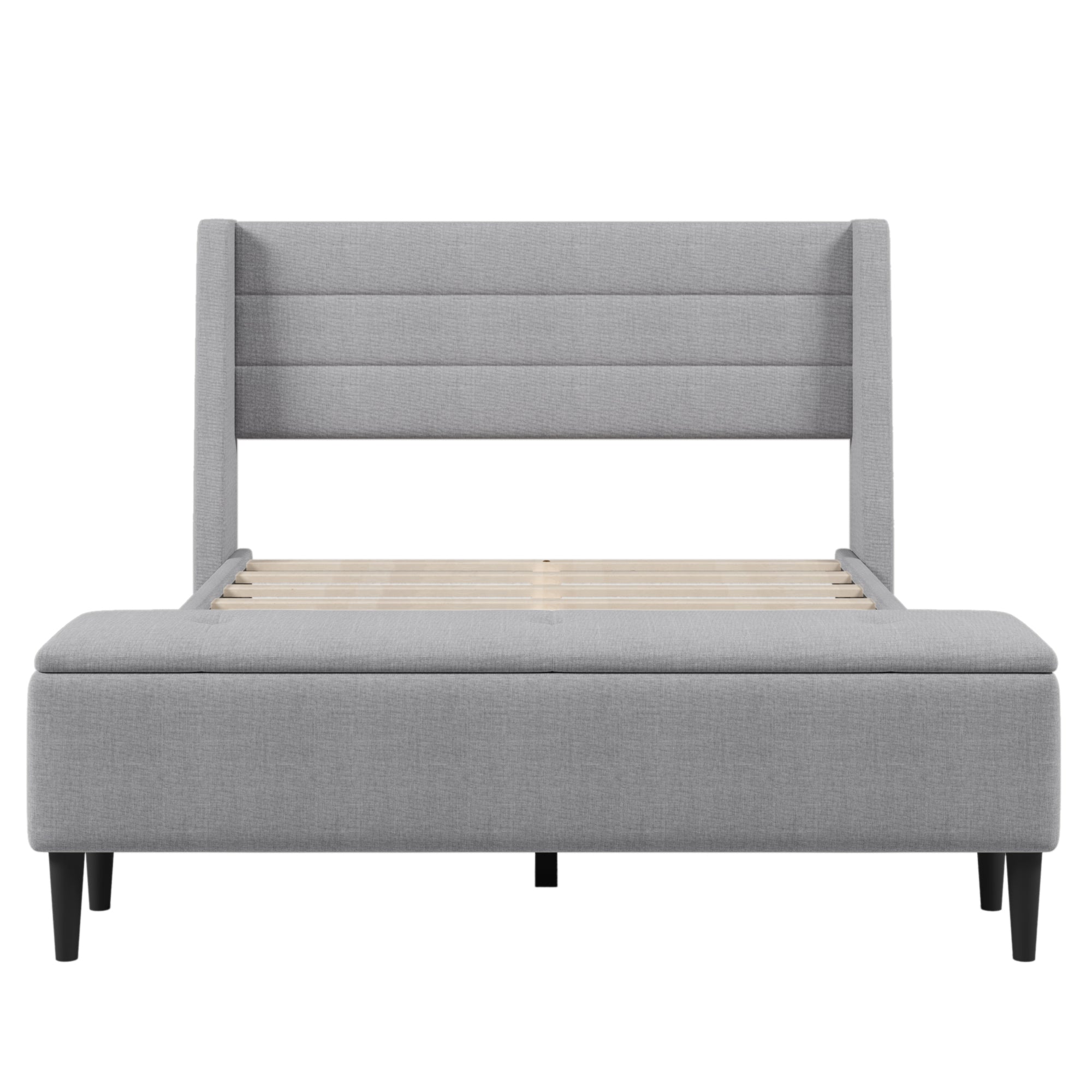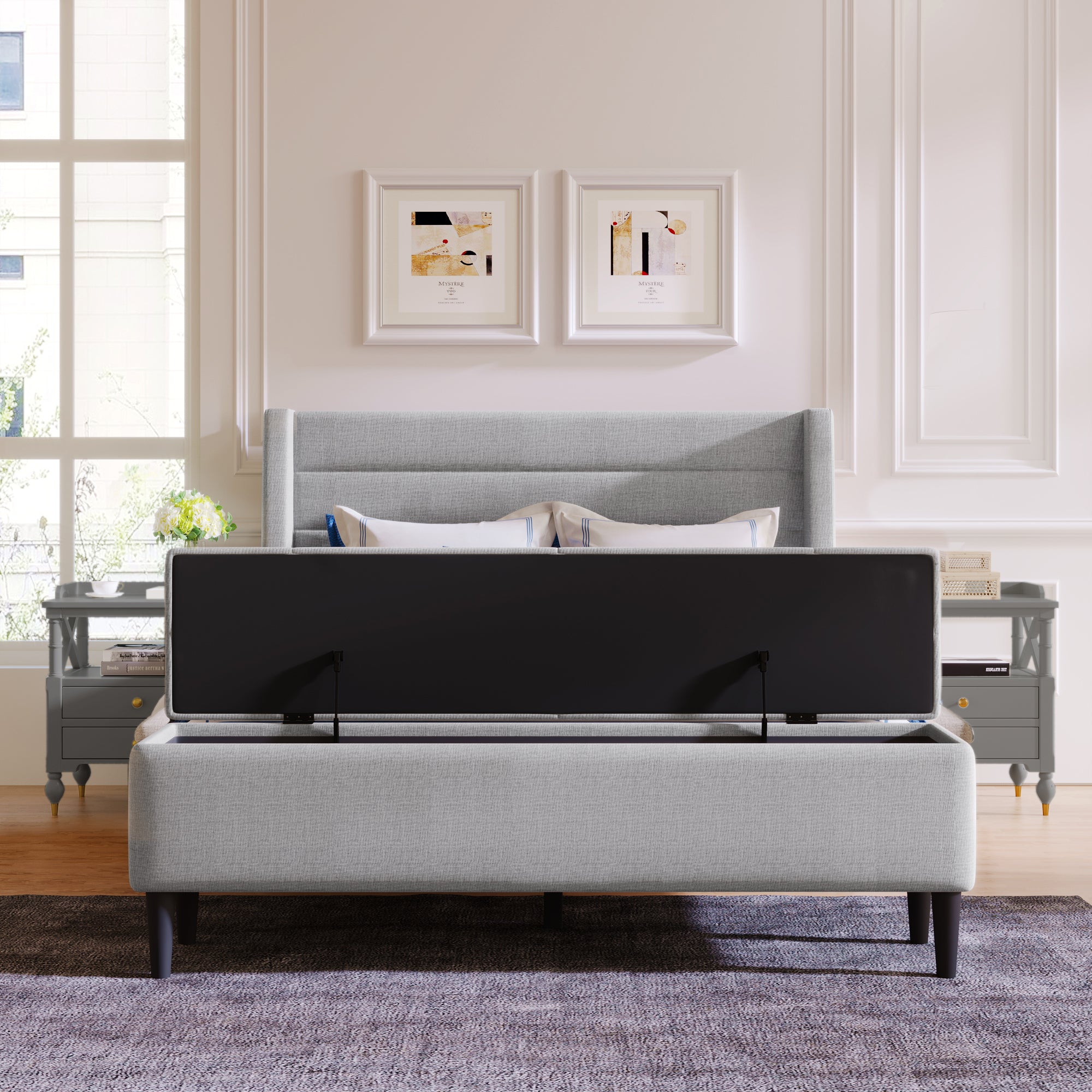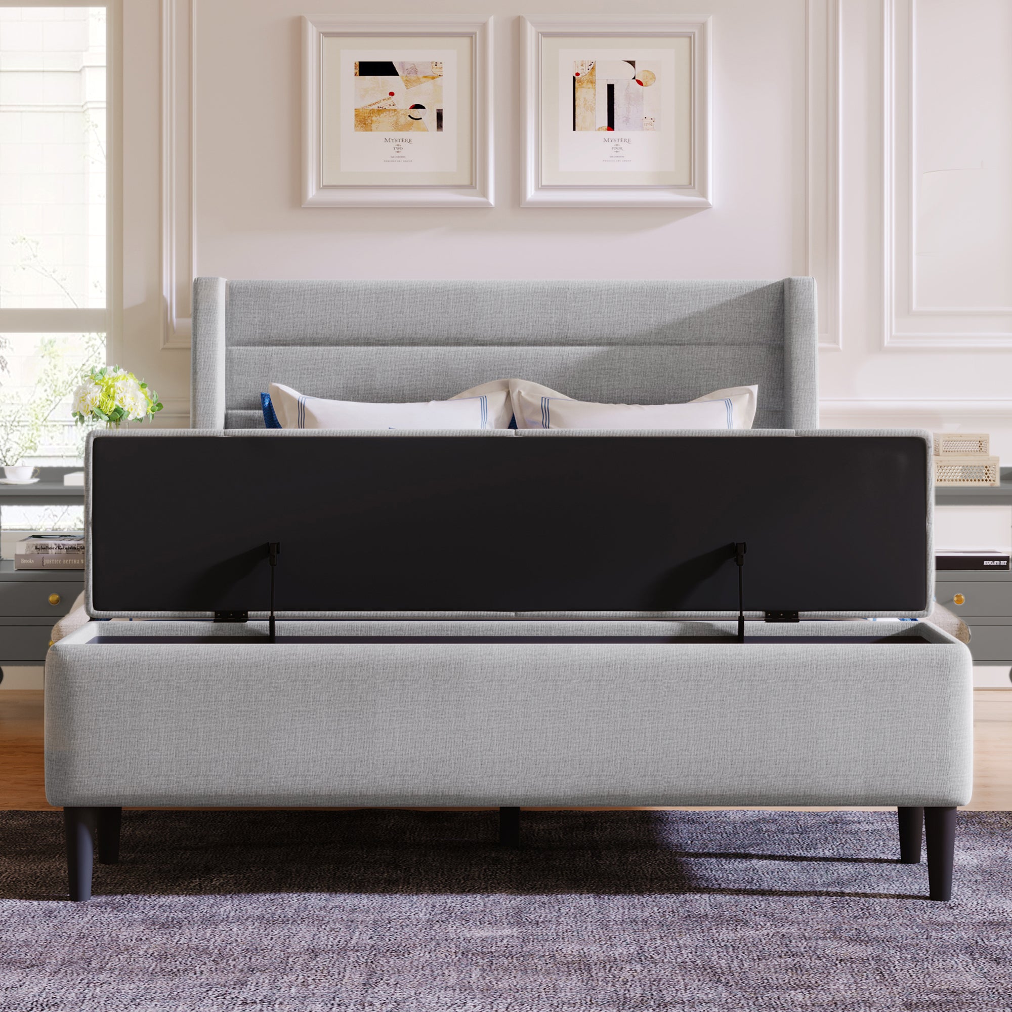If you're lacking space to tuck away your cherished belongings, if your closets are bursting at the seams, you should really consider buying this bed. Transform your bedroom with this bed with cushioned headboard and storage ottoman. The wingback bed is upholstered with beige fabric and detailed with linear tufting for texture. A matching storage ottoman is included to easily organize extra bedding.
